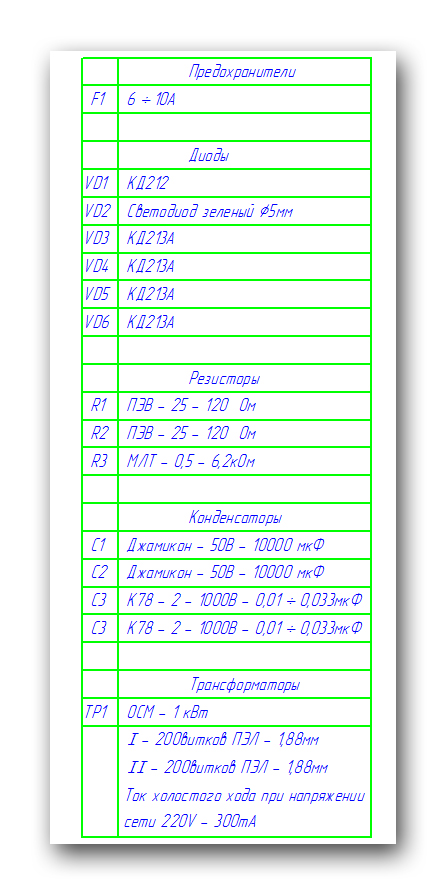Ниже представлен перечень элементов используемых в комбинированном сетевом фильтре.
