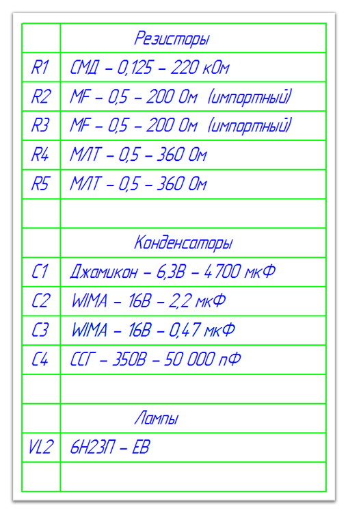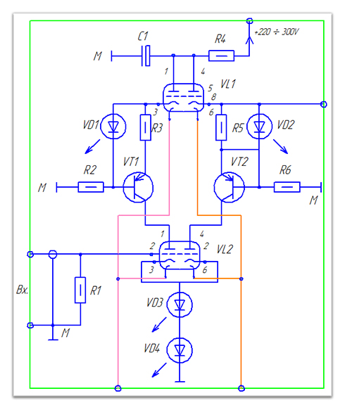В катодной цепи для обеспечения автоматического смещения работы лапового каскада устанавливаются два красных светодиода повышенной яркости (колба диаметром 5 мм).