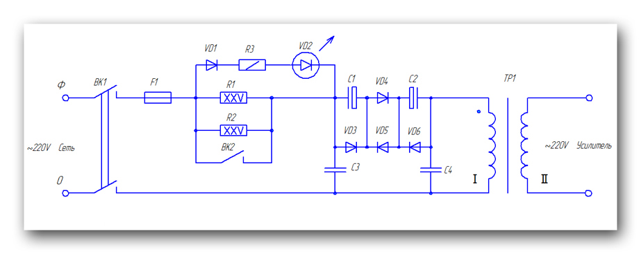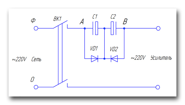 Фильтр исключающий постоянную составляющую бытовой сети выполнен на неполярных конденсаторах С1, С2 и диодах VD3, VD4, VD5, VD6.